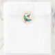 Com um texto monográfico facilmente personalizado, este adesivo é embelezado com um gráfico de estilo Meio século que representa um pomar de palmeiras simples em laranja e verde à volta de um oásis em forma de bumerangue ou piscina de natação em um azul-aqua vívido. A cor de fundo da areia pode ser editada.