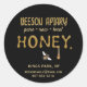 Um belo rótulo distintivo com a palavra HONEY, que parece ter sido derramado sobre um fundo preto - completo com uma grande prega e uma abelha de mel.