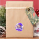 Linda menininha antiga de roupa roxa segurando uma caixa de presente neve e pinheiro e fundo nevado. Adicione um charme retrô ou nostálgico aos seus cartões de Natal ou sacos de tratamento de festa!