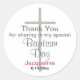 Elegante Obrigado... adesivos Baptism redondos para a menina. Simples cruz prateada pintada manualmente com sotaques dourados contra fundo branco. Personalize com o nome do seu filho em um script cor-de-rosa e data em texto preto. Trabalho de arte gráfico original e Design © TamiraZDesign.