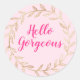 Um adesivo branco rosa-rosado brilhante e bonito, cor-de-rosa, cor-de-rosa, clássico, redondo, com as palavras "Hello Gorgeous" num elegante roteiro rosa-quente.
