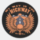 "Meu caminho é a autoestrada", texto com crânio alado e estrada indo para as montanhas e um pôr do sol com teias. T-shirts, prostitutas, cartas, presentes.