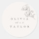 Elegant small round wedding sticker featuring delicate floral line art and decorative borders. Designed with a clean, modern layout that blends serif and cursive fonts for timeless sophistication. Perfect for sealing envelopes, decorating favors, or adding a coordinated touch to wedding stationery. Fully customizable template with editable text fields for names, initials, or wedding date. Matches the Minimalist Floral Line Art Wedding Suite for a cohesive look across your celebration.