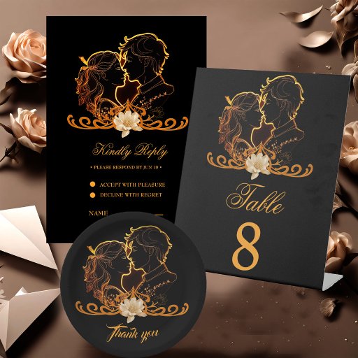 Misterioso e na moda design em ouro e preto. A combinação de ouro e negro cria um equilíbrio harmonioso entre elegância e modernidade que desenhar a atenção dos hóspedes e os estabelece para a próxima ocasião festiva.