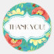 Este é um "Obrigado Sticker" correspondente ao convite de casamento do mesmo nome. COLOR PALETTE: turquesa, azul-lacrimejo, coral, vermelho, amarelo, laranja e verde limão com um toque de chocolate marrom. COLLECTION: Corresponding Obrigado Notes, Note Cards. Criada da trabalho de arte de cor d'água original pintada manualmente por Audrey Jeanne Roberts, esta design floral imaginativa moderna tem uma combinação de cores moderna. Flores aleunculus, em forma de círculo, com vários elementos florais brancos, bonitos e estilticamente fundidos são jogados sobre a cor de fundo. Alguns se assemelham a rosas, bagas e margaridas selvagens com folhas de estilo férn. Um quadro de estilo de colchete tem bolinhas e uma borda do tipo espiral de caligrafia. Há uma grande variedade de combinações de cores disponíveis com este padrão.