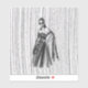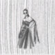 Esta é uma ilustração de moda preto-e-branco elegante que apresenta uma mulher confiante em um vestido dramático com ombro caído, com enfeites florais intrincados e uma capa fluída e transparente. O fundo tem uma textura de linha vertical impressionante, adicionando um senso de profundidade e movimento