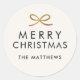 Add a touch of understated elegance to your holiday gifts, cards, and envelopes with these minimalist Christmas stickers. Featuring a simple gold bow illustration and clean modern typography, this timeless design pairs effortlessly with any wrapping style—from kraft paper to classic white. Personalize with your family name for a custom finishing touch that feels polished and festive.