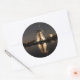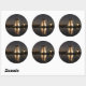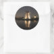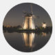 Um autocolante fotográfico redondo de uma paisagem com vários moinhos de vento, iluminados à noite, com reflexo na água do canal tranquilo em Kinderdijk, Países Baixos.