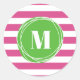 Personalize esses adesivos modernos e femininos com padrão de listras e monograma. O design apresenta o seu dentro de monograma com um círculo abstrato verde num padrão listrado cor-de-rosa. São muito úteis para muitas ocasiões, como selos de envelopes, etiquetas de livros e projetos DIY. Fácil de personalizar clicando no botão personalizar.