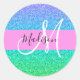 A cinzenta e o glam azul, verde, aqua e turquesa mermaid glitter brilham o nome do monograma do gradiente e o adesivo redondo clássico inicial. Seu nome personalizado e monograma são escritos em um elegante roteiro escrito à mão com um fundo rosa. Um aniversário perfeito ou presente de Natal!