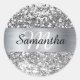 Crie seu próprio adesivo redondo clássico com cinza falso e elegante, brilho no estilo crocante confetti, emparelhado com uma fina fita metálica esfregada prateada, falso, para o monograma. O monograma preto-branco e o nome próprio apresentam um roteiro de caligrafia moderno que pode ser personalizado. Certas letras precisarão ser movidas para o centro com esta bela caligrafia. A banda e a reluzente do falso filme de luxo são imagens digitalmente criadas que impressão gostam de uma foto.