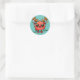 Uma criatura fofinha, ao estilo cartoon, com pelo laranja felpudo e orelhas proeminentes parece alegre com um nariz vermelho brilhante e um sorriso dentado. É adorado com chifres que têm luzes de Natal e ornamentos enrolados neles, alinhando com o texto festivo do "Monstro do Papai noel" abaixo dele.