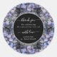 A bold and sophisticated Thank You Round Sticker featuring dramatic dusty blue and grey floral illustrations against a stark black background. The crisp white typography and classic layout set an elegant, moody tone. Perfect for a formal evening or a sophisticated wedding.