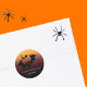 Adesivo preto, vermelho e laranja de Halloween com três morcegos silhueta voando com olhos assustadores e "obrigado por um tempo assustador" e o nome da criança em tipografia moderna.
