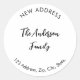 Mudamos, devolva o adesivo de endereço. Personalize e adicione seu nome de família, seu novo endereço. Texto curvo. Fundo branco, texto preto.