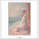 trabalho de arte de fantasia hipnotizante com uma etérea encharcada em tecido fluido, sentada pacificamente numa praia cor-de-rosa macia com ondas suaves e peixes flutuantes no ar. Cercado por flores florescentes e tons pastéis, esta cena costeira surreal irradia serenidade e maravilha. Perfeito para amantes da fantasia, paisagens de sonhos românticos e arte suave surreal — ideal para impressões, decoração de parede e acessórios elegantes.