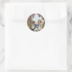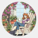 Uma ilustração divertida de um gibi de uma mulher sentada na cadeira de grama em seu pátio, com seu gato, uma xícara de café ou chá e cercada por clematis roxos e plantas penduradas.