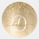 Personalize facilmente este design de adesivo chic redondo com tendência, com brilho brilhante bonito de ouro num fundo metálico escovado de ouro.