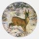 Imagem de Natal com uma jovem rena ou veado bebê. É o inverno na floresta com neve.