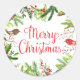 Lindo adesivo de "Feliz Natal" em aquarela. Este design apresenta pássaros em aquarela, poinsettias, agulhas de pinheiro, frutas vermelhas e pinhas. Perfeito para seus envelopes festivos de Natal.