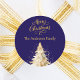 Um fundo de cor azul. Decorado com uma árvore coberta de neve. Feliz Natal é escrito com uma elegante escrita estilo escrita à mão. Personalize e adicione seu nome de família. Texto do ouro.