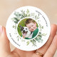 Este Natal de texto personalizado | colante de círculo de férias apresenta cor d'água pintada de eucalipto, folhas verdes dispostas como uma armação com uma foto. Mande alegria de férias para sua família e amigos.