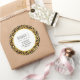 Adesivos comerciais com um padrão de na moda. Manchas negras negras exóticas num fundo de ouro. Um estilo selvagem mas elegante. A camada sobre o topo é uma moldura de círculo branco com uma borda falsa de folha de papel dourada, com o seu dentro de texto personalizado.