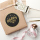 This round sticker is shown with a Happy New Year stars print with a gold faux glitter border.