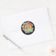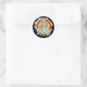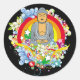 Meditando Buda pacificamente se senta entre um conjunto colorido de estrelas, arco-íris, flores e símbolos Yin Yang! Uma explosão de coloração e de consciência! Olhos pegando presentes de Buda!