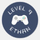 Projetados para coordenar com nossos convites de festas de aniversários e acessórios do Nível Superior, esses adesivos favoritos do jogador legal apresentam o "nível" (idade) do jogador e o seu nome em letras retroativas em um fundo azul marinho. Um controlador de vídeo no centro completa o design.
