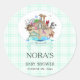 O cheio de Arca de Noé de animais com faixa verde de menta que lê "Bebê está a caminho!" num fundo de gingham da casa da moeda.