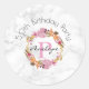 Um adesivo de festa de aniversário personalizado desenhado com uma coroa floral feita com flores e galhos, galhos e folhas cor-de-rosa e laranja. Esta imagem digital foi originalmente criada com aquarelas e é fofa e tenda. O fundo é uma imagem de mármore branco elegante. Personalize com um nome inicial, nome e título do evento monograma.