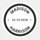 Os nomes personalizados da fronteira branca moderna datam presente de casamento a favor dos adesivos clássicos redondos, selos, etiquetas. Branco com borda negra e grossa.