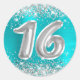 Fabuloso adesivos de 16 ou 16 anos para a sua filha. O número 16 em uma imagem de texto de balão indefinida. A imagem de fundo apresenta uma folha de metal azul-turquesa-ciano-aqua e azul-azul-turquesa com gráficos de arte digital com brilho fino prateado. Os faíscas, brilho e folha de luxo serão criados por elementos artísticos criativos que impressão gostam de uma foto.