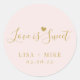 O elegante favorito de casamento personalizado favorece adesivos redondos/etiquetas com "o amor é doce" na caligrafia moderna com um coração brilhante a ouro. Personalize com os nomes da noiva e do noivo e a data do casamento. Aplique os adesivos/etiquetas em caixas, bolsas ou frascos para os favoritos/presentes exclusivos de casamento DIY.