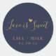 O elegante favorito de casamento personalizado favorece adesivos redondos/etiquetas com "o amor é doce" na caligrafia moderna com um coração brilhante a ouro. Personalize com os nomes da noiva e do noivo e a data do casamento. Aplique os adesivos/etiquetas em caixas, bolsas ou frascos para os favoritos/presentes exclusivos de casamento DIY.