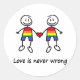 O amor nunca é camisetas e presentes errados - orgulho gay design com duas pessoas em cores arco-íris segurando um coração vermelho.