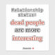 Este simples autocolante humorístico tem a piada "Relationship status: mortos are more interessante" em letras na moda modernas preto e vermelho sobre fundo branco. É um presente engraçado para um arqueólogo, antropólogo, historiador antigo, amante clássico da literatura, ou qualquer pessoa cujo trabalho ou hobby gira em torno... bem, você adivinhou: pessoas mortos. Ou talvez você possa dar isso a um amigo que ama livros, séries de TV e filmes, mas sempre se apaixona por personagens que são condenados por Canon.