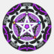 Quinze corvos em torno de um pentáculo pagão branco num campo de roxo com joia roxa central. As joias que representam os elementos com o cabo elético triquetra prateado.