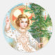 Detalhe de uma imagem encantadora e vintage da Criança Cristo entregando pessoalmente uma árvore de Natal acesa para uma casa que se preparou para Sua chegada. Aqui, Jesus, sentado sobre Sua mangueira cheia de palha, veste uma manga branca decorada com uma cruz de ouro e estrelas. No centro da cruz em Seu peito está um quatrefoil contendo o IHS, um de vários monogramas gregos para seu nome. Ele levanta sua mão direita em bênção e segura a árvore de Natal na vertical em Sua esquerda. Perfeito para o Advent! + Crédito Imagem: Detalhe de "Gloria in excelsis Deo", impressão devocional na cromolithografia de marrã, final do 20, editor original (talvez alemão) desconhecido, do acervo privado de efemércia religiosa do designer.