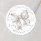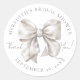 Um adesivo clássico e elegante de chuveiro de noiva com laço branco, apresentando um laço de aquarela branca macia superdimensionado. No topo, tem o nome da noiva e “Chuveiro de Noiva”, e na parte inferior, a data. No centro, ao lado do laço branco, está “Obrigada!” em escrita graciosa. Este design simples e atemporal de chuveiro de noiva usa texto cinza em uma mistura de tipografia serifada e manuscrita, criando uma aparência refinada e encantadora. Você pode personalizar as cores da fonte e o fundo para se adequar ao seu estilo. Etiqueta Adesiva Personalizada de Agradecimento para Tema de Chuveiro de Noiva com Laço Branco de Aquarela Elegante.