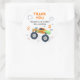 Obrigado Aniversário do Moderno Monster Car Trucks Sticker Labels apresenta o texto "Obrigado por vir ao meu partido" e personalizado com o seu nome com um carro monstro colorido. Fabuloso para as comemorações de festa de aniversário infantil. Projetado pelo Evco Studio www.zazzle.com/store/evcostudio