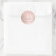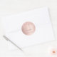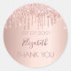 Um adesivo, etiqueta de favor para um chuveiro de noiva feminino e glamoroso. Um fundo metálico rosa dourado falso com um brilho rosa falso, gotejamento de tinta, visual de gotejamento. O texto: Obrigado. Modelo para nome e data. O nome é escrito em rosa dourado escuro com um estilo de letra manuscrita moderna grande.