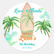 Obrigado de aniversário tropical de verão no oceano de praia surfando você favorece o adesivo. Bom para os aniversários temidos da praia de verão. Palmeiras e conselhos surfs.