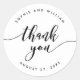 Adesivo de agradecimento versátil com as palavras "Obrigado" em uma escrita cursiva relaxada em preto contra um fundo branco que é perfeito para casamentos ou vários eventos como chá de panela, chá de bebê, etc.