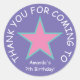Personalizado Agradeço por ter vindo Festa de aniversário de adesivos. Design de logotipo de estrela engraçada para meninos e meninas. Obrigado neutro que você rotula com logotipo multicor personalizável. Alterar as cores de preenchimento e linha. Design de tipografia bonita com ícone de estrela para o obrigado de aniversário que você prefere. Também é útil como selantes de envelopes de chá de fraldas para dizer obrigados para vir ou obrigado para compartilhar nosso dia especial! Exemplo: cores rosadas e roxas.
