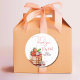 Celebre a chegada do seu pequeno com o nosso obrigado "Berry Sweet" que você escolheu. Este encantador adesivo apresenta uma ilustração impressionante de aquarela de panquecas suculentas de morango, perfuradas com xarope de bordo de morango. As panquecas estão arranjadas e cercadas por flores delicadas e verde-peludas, criando uma cena caprichosa e encantadora. As matizes suaves, pastéis e detalhes intrincados da ilustração evocam um senso de doçura e alegria, captando perfeitamente a essência de um chá de fraldas. A design divertida, mas elegante, faz deste adesivo um encantador guardião para os seus hóspedes.