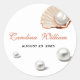 "Oceano 'A Little Pearl' sob o adesivo clássico redondo do chá de fraldas marinho, com tons suaves de creme e delicados sotaques de pérolas. Este elegante adesivo adiciona um toque refinado e encantador aos seus favoritos para festas, convites, ou decorações, complementando perfeitamente a sua celebração submarina."