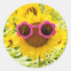 Óculos de sol cor-de-rosa sobre girassol num campo de girassol.