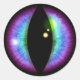Olhos grandes, azuis e roxos, com pupilas cortadas.